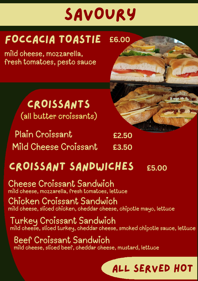 Light food options include a variety of pastries and bakery items such as plain and mild cheese croissants, bagels, paninis, focaccia toasties, and choco crois. The menu also includes savoury items like chilli.