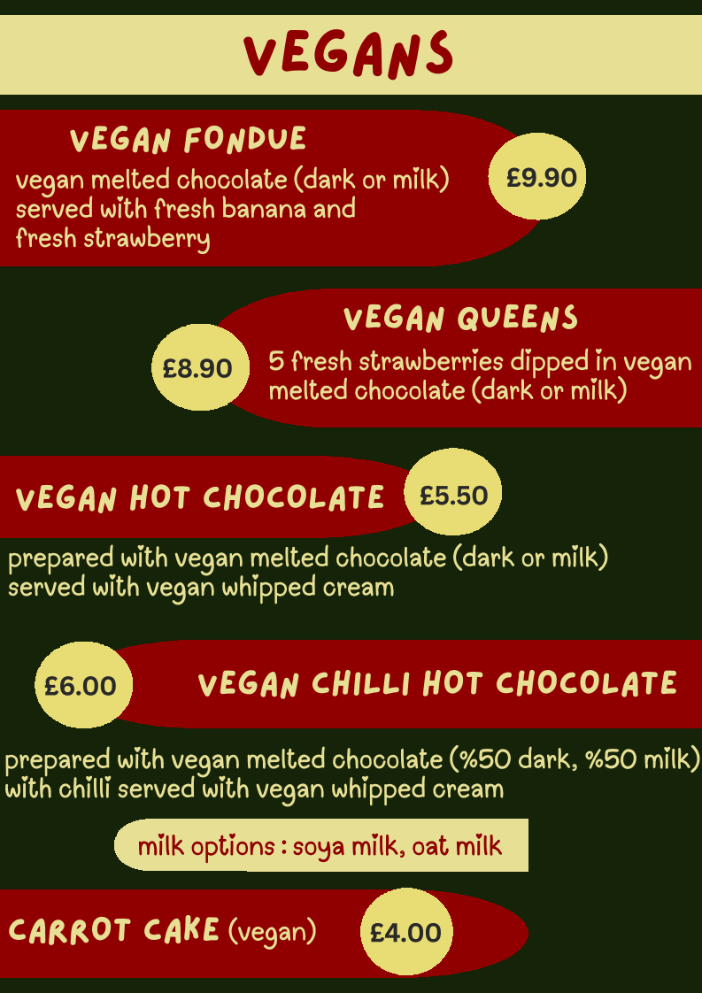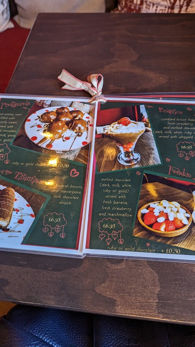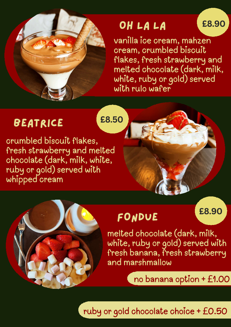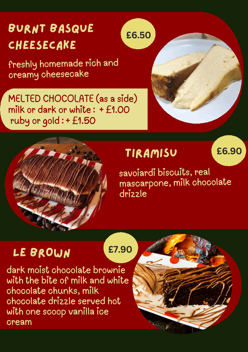 For dessert, the menu highlights chocolate-based offerings including fondue, dark chocolate hot chocolate, chocolate-coated Basque cheesecake, and gelato. These items provide choices for customers interested in sweet treats alongside their beverages.